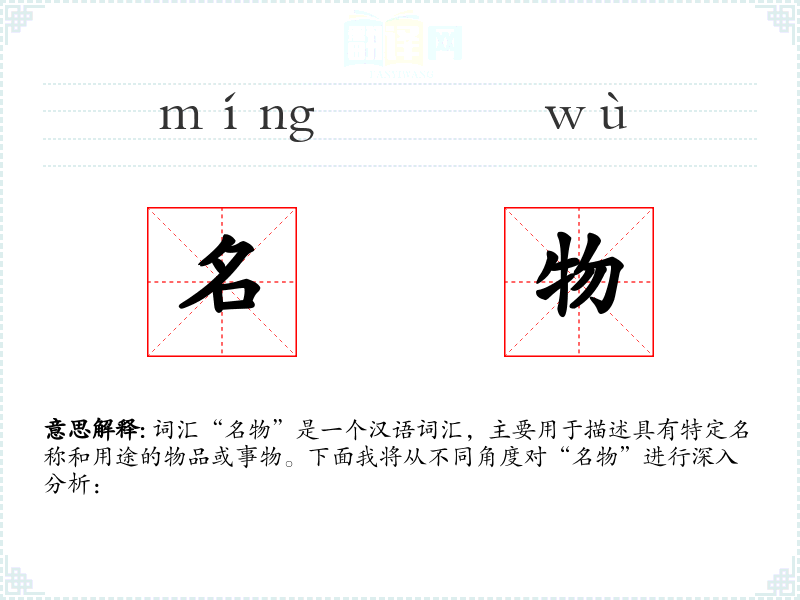 词汇“名物”是一个汉语词汇,主要用于描述具有特定名称和用途的物品或事物。下面我将从不同角度对“名物”进行深入分析: