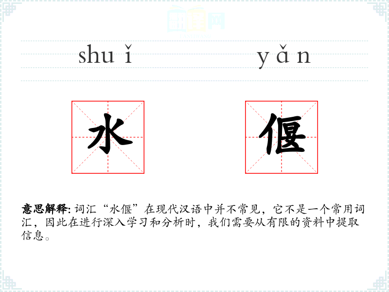 词汇“水偃”在现代汉语中并不常见,它不是一个常用词汇,因此在进行深入学习和分析时,我们需要从有限的资料中提取信息。