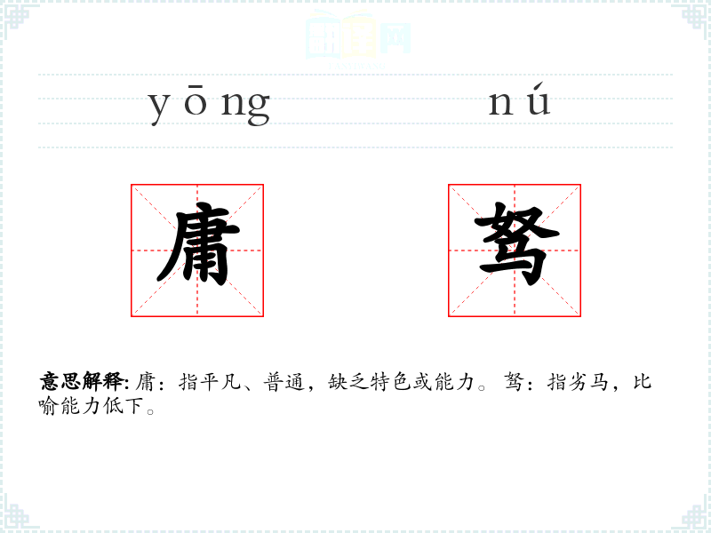 庸:指平凡、普通,缺乏特色或能力。 驽:指劣马,比喻能力低下。