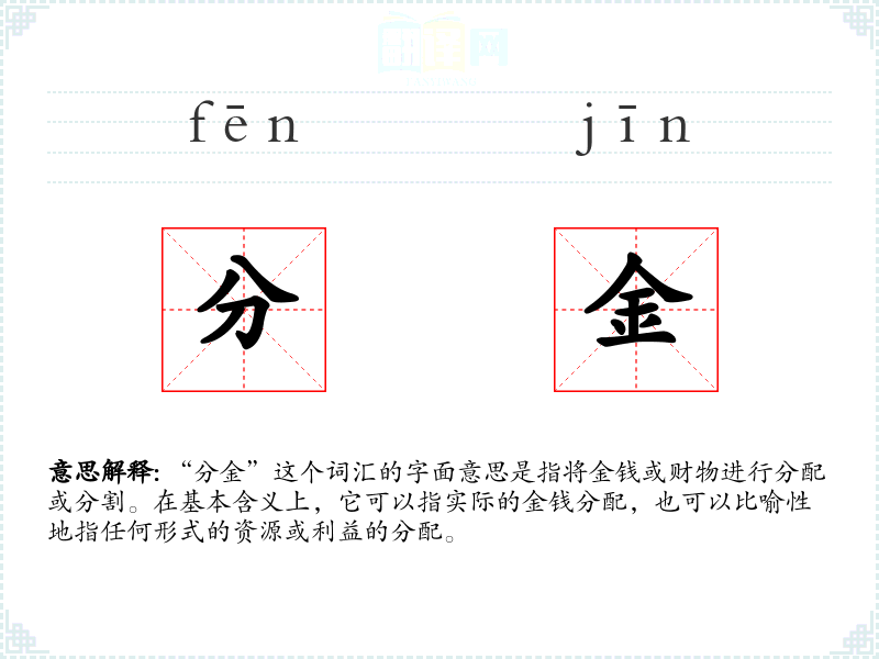 “分金”这个词汇的字面意思是指将金钱或财物进行分配或分割。在基本含义上,它可以指实际的金钱分配,也可以比喻性地指任何形式的资源或利益的分配。