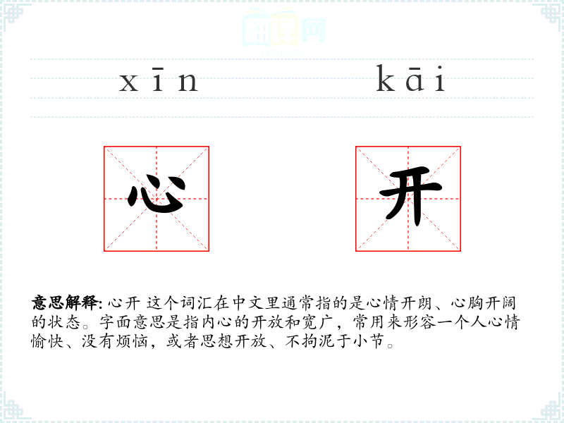 心开 这个词汇在中文里通常指的是心情开朗、心胸开阔的状态。字面意思是指内心的开放和宽广,常用来形容一个人心情愉快、没有烦恼,或者思想开放、不拘泥于小节。