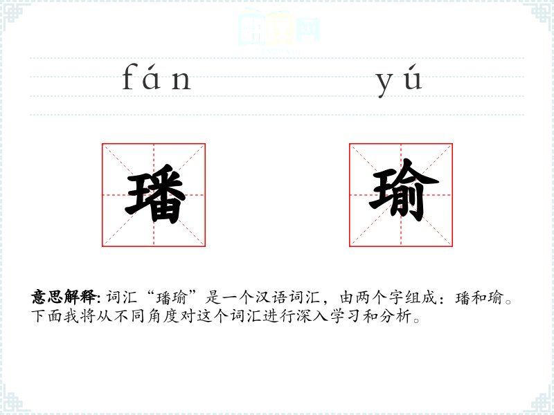 通过对“璠瑜”这个词汇的学和分析,我更加深入地理解了它在汉语中的意义和文化内涵。这个词汇不仅形容了美玉,也象征了人们对美好事物的追求和赞美。在语言学和表达中,了解这样的词汇有助于丰富我的词汇量和表达能力。