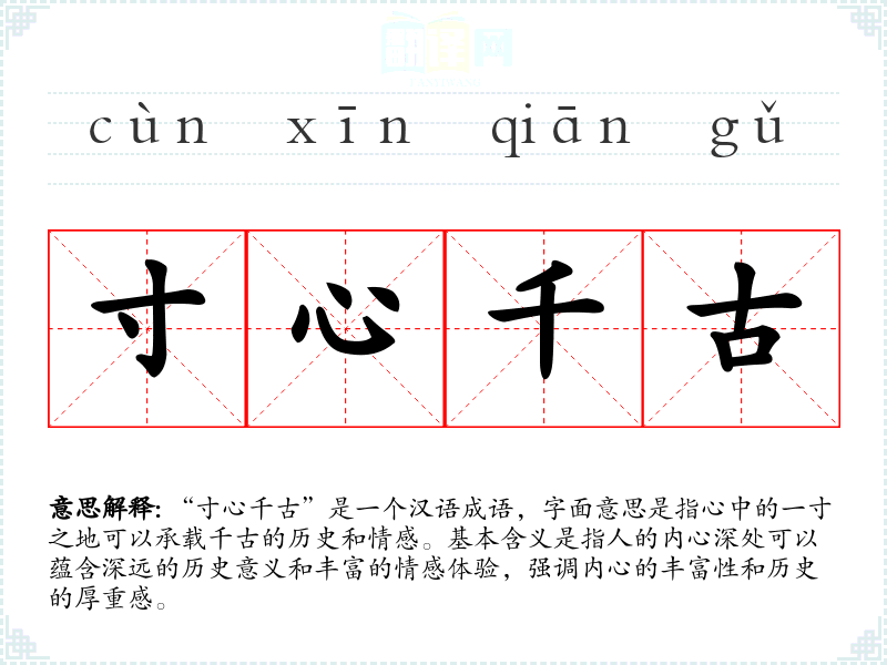 “寸心千古”是一个汉语成语,字面意思是指心中的一寸之地可以承载千古的历史和情感。基本含义是指人的内心深处可以蕴含深远的历史意义和丰富的情感体验,强调内心的丰富性和历史的厚重感。