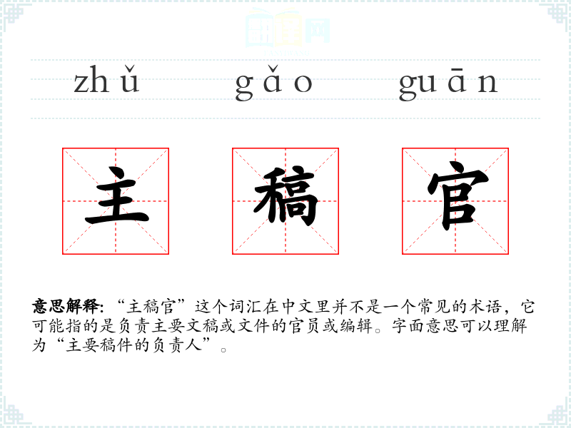“主稿官”这个词汇在中文里并不是一个常见的术语,它可能指的是负责主要文稿或文件的官员或编辑。字面意思可以理解为“主要稿件的负责人”。