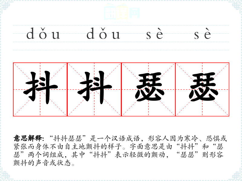“抖抖瑟瑟”是一个汉语成语,形容人因为寒冷、恐惧或紧张而身体不由自主地颤抖的样子。字面意思是由“抖抖”和“瑟瑟”两个词组成,其中“抖抖”表示轻微的颤动,“瑟瑟”则形容颤抖的声音或状态。
