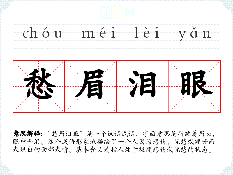 “愁眉泪眼”是一个汉语成语,字面意思是指皱着眉头,眼中含泪。这个成语形象地描绘了一个人因为悲伤、忧愁或痛苦而表现出的面部表情。基本含义是指人处于极度悲伤或忧愁的状态。