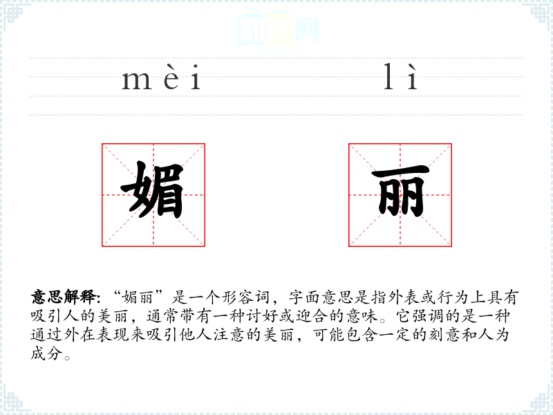 “媚丽”是一个形容词,字面意思是指外表或行为上具有吸引人的美丽,通常带有一种讨好或迎合的意味。它强调的是一种通过外在表现来吸引他人注意的美丽,可能包含一定的刻意和人为成分。