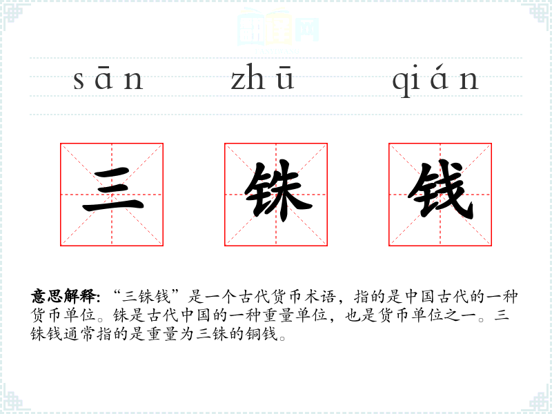 “铢”字最早见于《说文解字》,原意为古代的一种重量单位,后来也用作货币单位。随着历史的发展,货币制度不断变化,三铢钱也逐渐退出了流通领域。