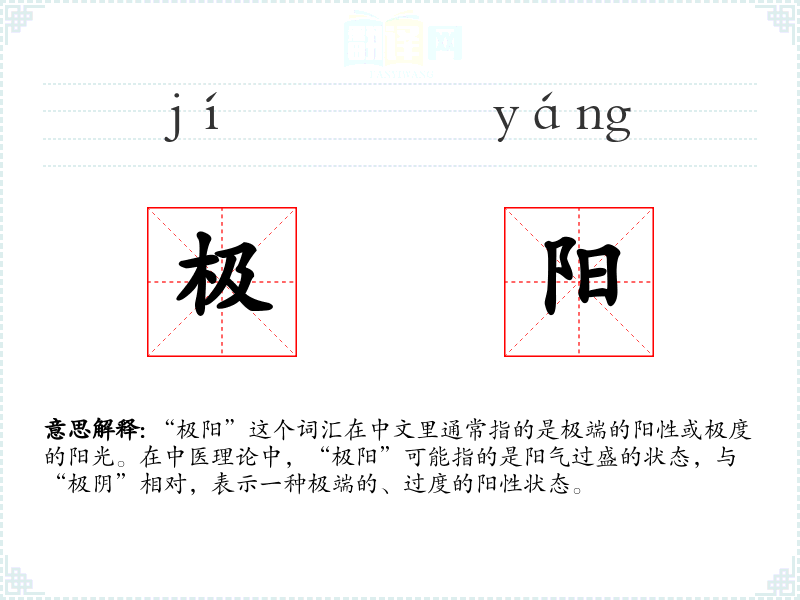 “极阳”这个词汇在中文里通常指的是极端的阳性或极度的阳光。在中医理论中,“极阳”可能指的是阳气过盛的状态,与“极阴”相对,表示一种极端的、过度的阳性状态。