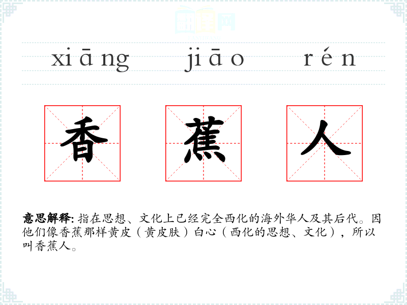 指在思想、文化上已经完全西化的海外华人及其后代。因他们像香蕉那样黄皮(黄皮肤)白心(西化的思想、文化),所以叫香蕉人。