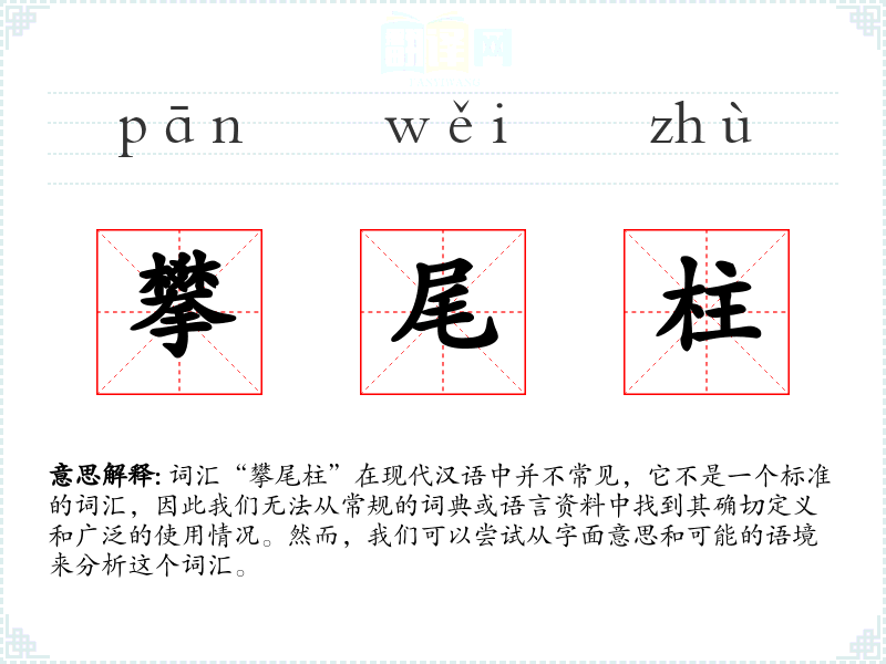 词汇“攀尾柱”在现代汉语中并不常见,它不是一个标准的词汇,因此我们无法从常规的词典或语言资料中找到其确切定义和广泛的使用情况。然而,我们可以尝试从字面意思和可能的语境来分析这个词汇。