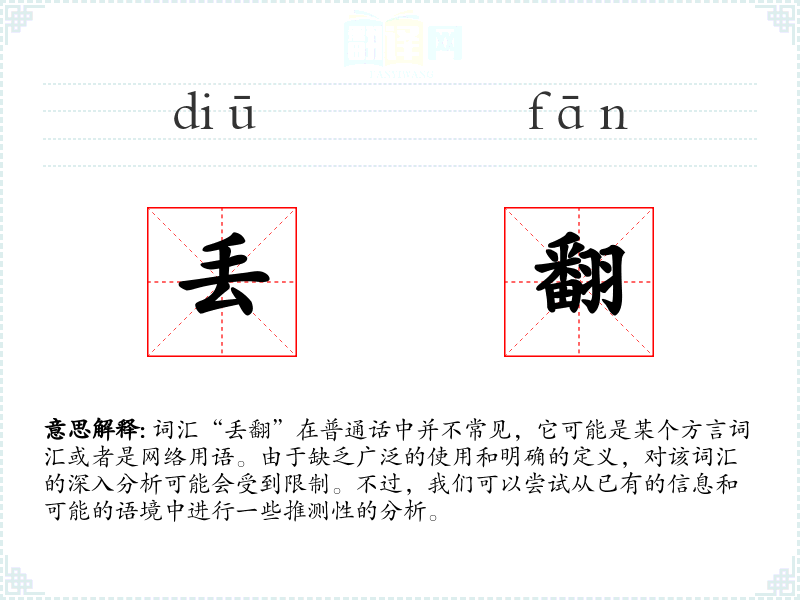 词汇“丢翻”在普通话中并不常见,它可能是某个方言词汇或者是网络用语。由于缺乏广泛的使用和明确的定义,对该词汇的深入分析可能会受到限制。不过,我们可以尝试从已有的信息和可能的语境中进行一些推测性的分析。