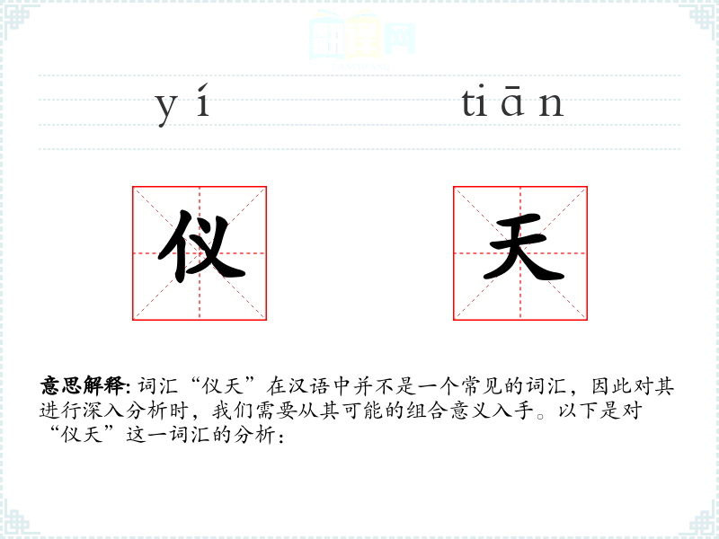 词汇“仪天”在汉语中并不是一个常见的词汇,因此对其进行深入分析时,我们需要从其可能的组合意义入手。以下是对“仪天”这一词汇的分析: