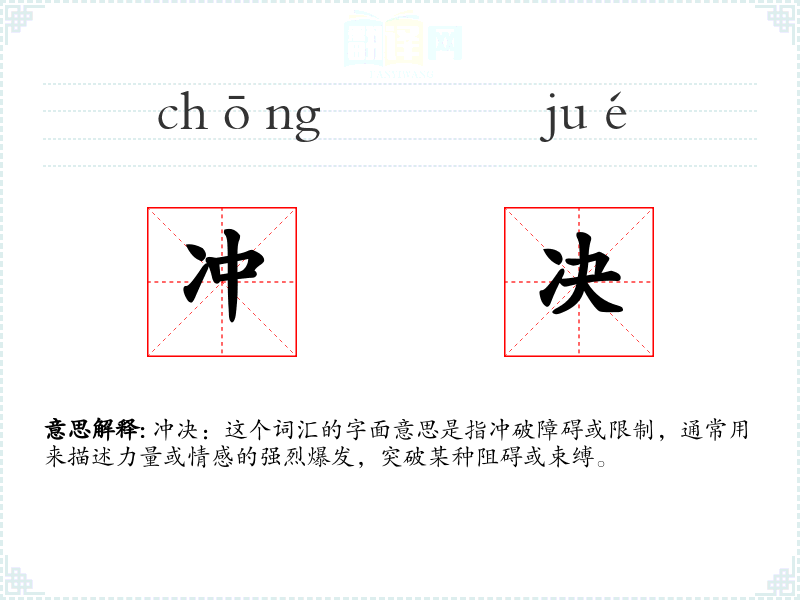 冲决:这个词汇的字面意思是指冲破障碍或限制,通常用来描述力量或情感的强烈爆发,突破某种阻碍或束缚。