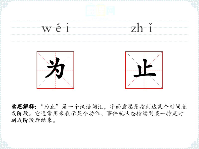 “为止”由“为”和“止”两个字组成。“为”在这里表示“作为”或“到”,“止”表示“停止”或“结束”。在古代汉语中,“为止”就已经存在,用法与现代汉语基本一致。