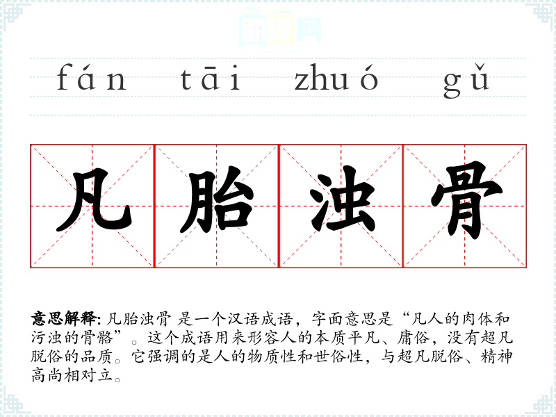 凡胎浊骨 是一个汉语成语,字面意思是“凡人的肉体和污浊的骨骼”。这个成语用来形容人的本质平凡、庸俗,没有超凡脱俗的品质。它强调的是人的物质性和世俗性,与超凡脱俗、精神高尚相对立。