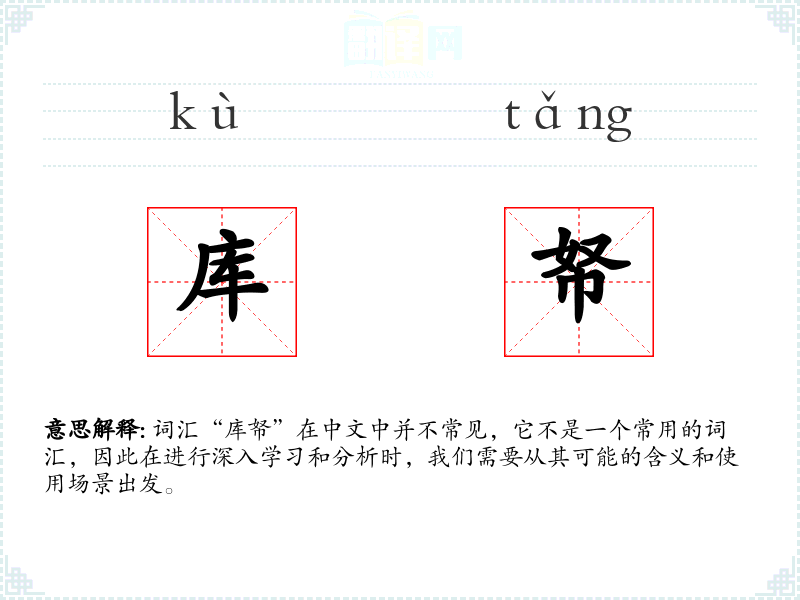 词汇“库帑”在中文中并不常见,它不是一个常用的词汇,因此在进行深入学*和分析时,我们需要从其可能的含义和使用场景出发。