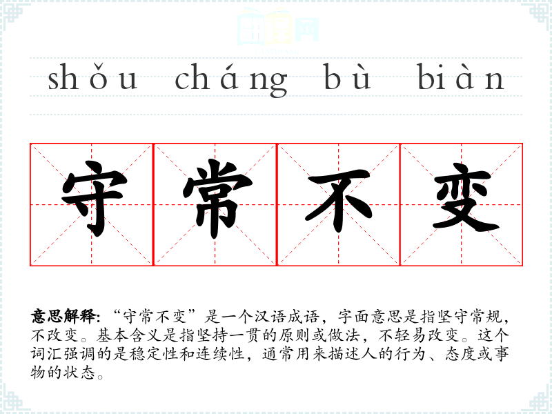 “守常不变”是一个汉语成语,字面意思是指坚守常规,不改变。基本含义是指坚持一贯的原则或做法,不轻易改变。这个词汇强调的是稳定性和连续性,通常用来描述人的行为、态度或事物的状态。