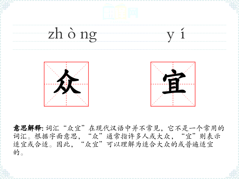 - 由于“众宜”不是一个常用词汇,其词源和演变不太明确。它可能是由“众”和“宜”两个常用词汇组合而成的新词。