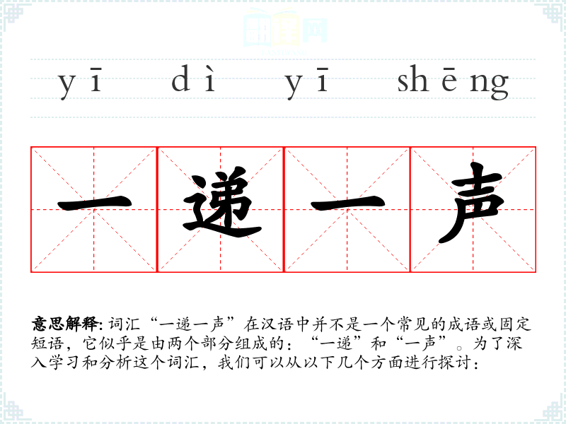 词汇“一递一声”在汉语中并不是一个常见的成语或固定短语,它似乎是由两个部分组成的:“一递”和“一声”。为了深入学习和分析这个词汇,我们可以从以下几个方面进行探讨: