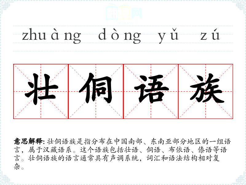 同义词:壮侗语系、壮侗语言群 反义词:这个词汇没有直接的反义词,但如果要表达不属于壮侗语族的语言,可以说“非壮侗语族的语言”。