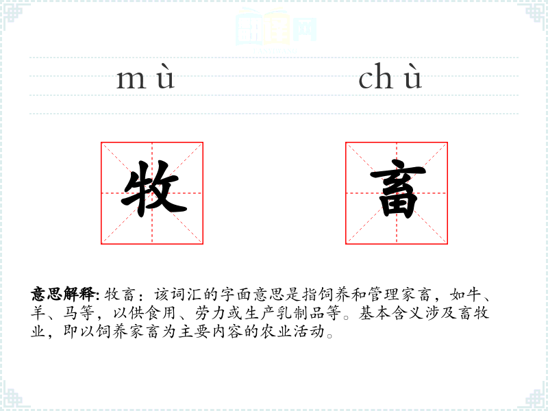 牧畜:该词汇的字面意思是指饲养和管理家畜,如牛、羊、马等,以供食用、劳力或生产乳制品等。基本含义涉及畜牧业,即以饲养家畜为主要内容的农业活动。
