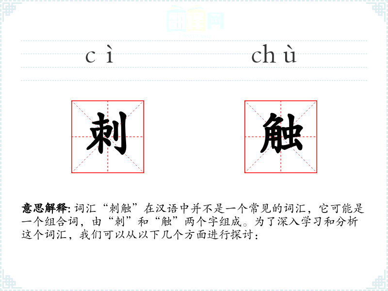 词汇“刺触”在汉语中并不是一个常见的词汇,它可能是一个组合词,由“刺”和“触”两个字组成。为了深入学习和分析这个词汇,我们可以从以下几个方面进行探讨: