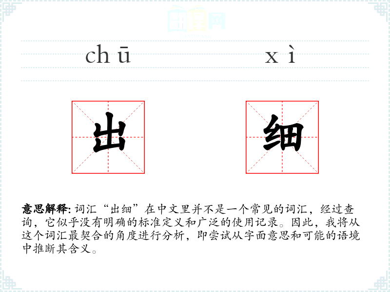 由于“出细”不是一个标准词汇,它在不同语境下的使用非常有限。可能的语境包括: