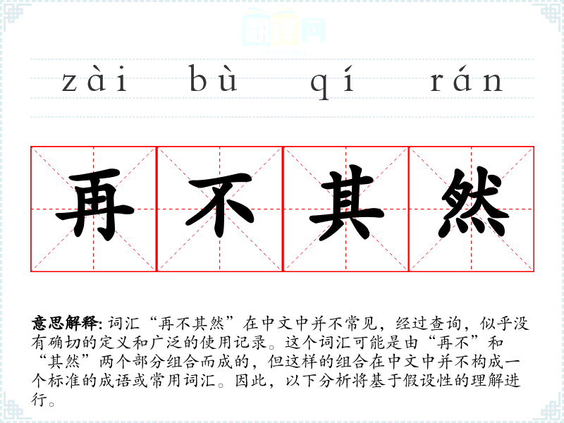 假设“再不其然”是一个组合词汇,可以理解为“再不”表示“不再”,“其然”可能源自“既然如此”或“如此这般”的意思。结合起来,可以理解为“不再如此”或“不再那样”。