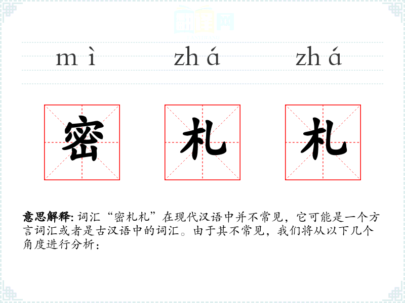 词汇“密札札”在现代汉语中并不常见,它可能是一个方言词汇或者是古汉语中的词汇。由于其不常见,我们将从以下几个角度进行分析: