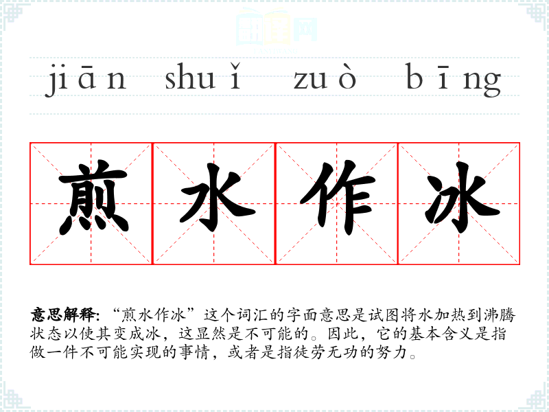 “煎水作冰”这个词汇的字面意思是试图将水加热到沸腾状态以使其变成冰,这显然是不可能的。因此,它的基本含义是指做一件不可能实现的事情,或者是指徒劳无功的努力。