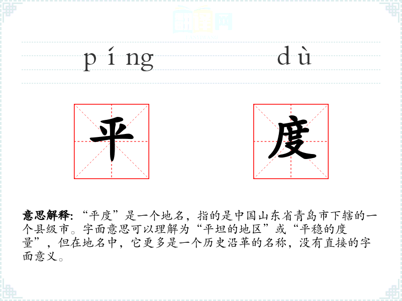 “平度”是一个地名,指的是**山东省青岛市下辖的一个县级市。字面意思可以理解为“平坦的地区”或“平稳的度量”,但在地名中,它更多是一个历史沿革的名称,没有直接的字面意义。