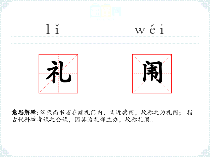 汉代尚书省在建礼门内,又近禁闱,故称之为礼闱; 指古代科举考试之会试,因其为礼部主办,故称礼闱。