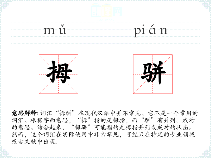 由于“拇骈”不是一个常用词汇,它在不同语境下的使用非常有限。可能出现在医学、解剖学或古代文献中,描述拇指的特殊状态或功能。