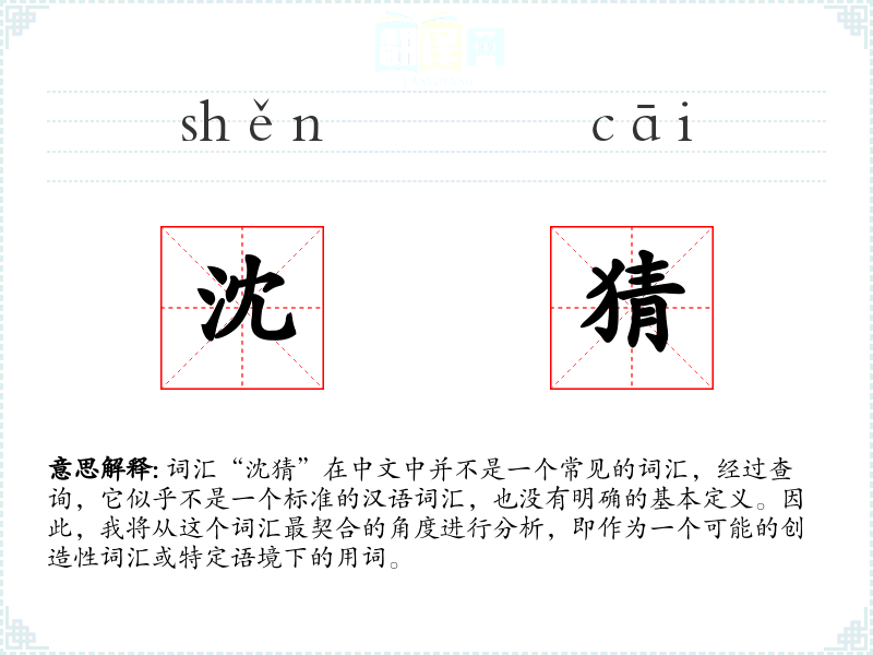 由于“沈猜”不是一个标准词汇,我们无法给出确切的基本定义。它可能是由“沈”(可能指深沉、沉默等含义)和“猜”(猜测)两个字组合而成的,暗示一种深沉的猜测或沉默中的推测。