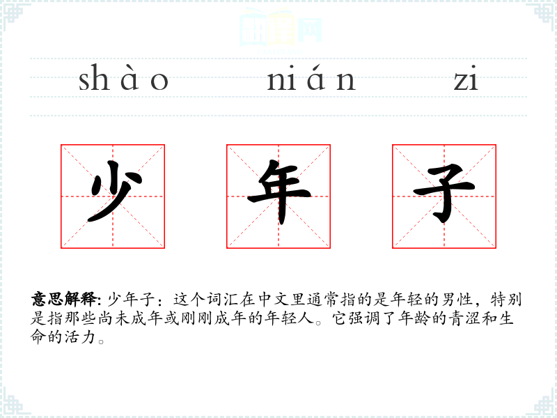 在英语中,“少年子”可以对应为“young man”或“teenager”,虽然在表达上有所不同,但都指向了年轻的男性这一概念。