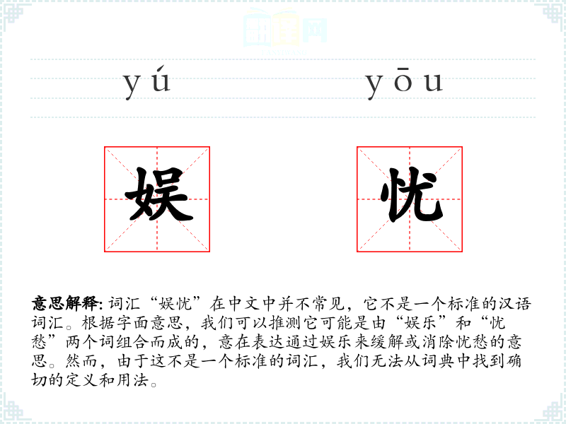 由于“娱忧”不是一个标准词汇,我们只能根据字面意思推测其含义为“通过娱乐活动来减轻或消除忧愁”。