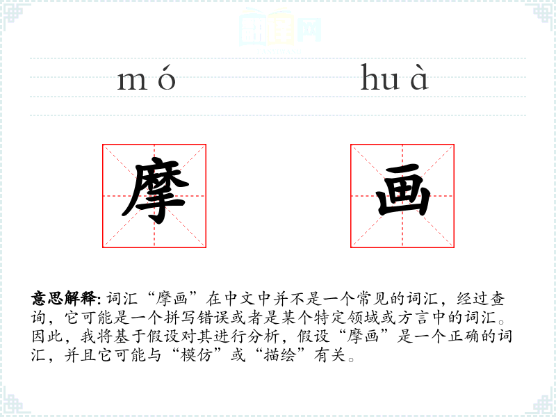 词汇“摩画”在中文中并不是一个常见的词汇,经过查询,它可能是一个拼写错误或者是某个特定领域或方言中的词汇。因此,我将基于假设对其进行分析,假设“摩画”是一个正确的词汇,并且它可能与“模仿”或“描绘”有关。