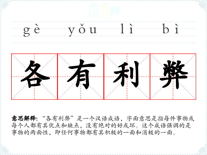 “各有利弊”是一个汉语成语,字面意思是指每件事物或每个人都有其优点和缺点,没有绝对的好或坏。这个成语强调的是事物的两面性,即任何事物都有其积极的一面和消极的一面。