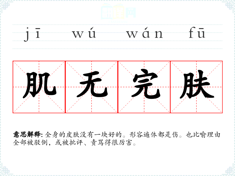 全身的皮肤没有一块好的。形容遍体都是伤。也比喻理由全部被驳倒,或被批评、责骂得很厉害。