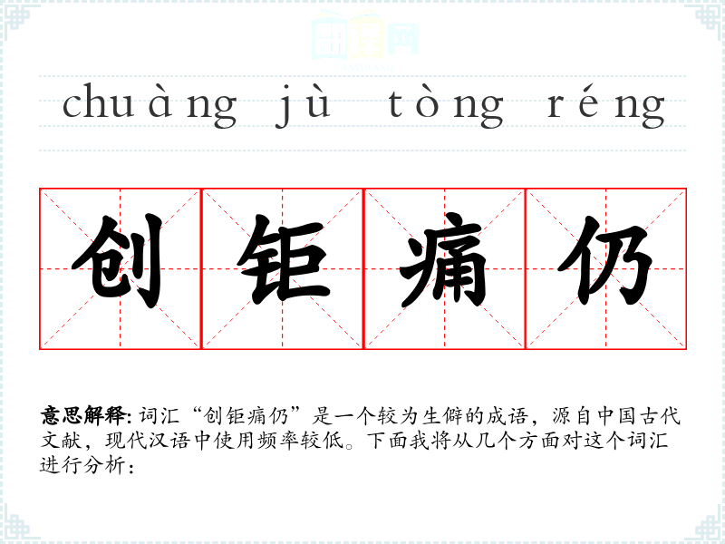 词汇“创钜痛仍”是一个较为生僻的成语,源自中国古代文献,现代汉语中使用频率较低。下面我将从几个方面对这个词汇进行分析: