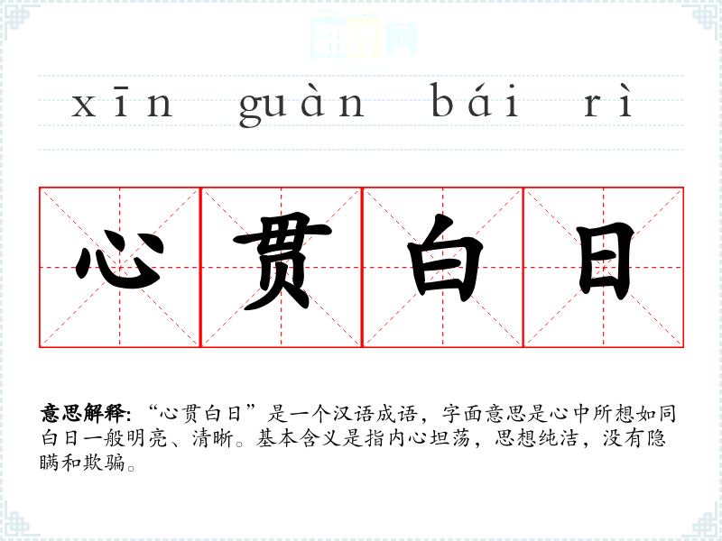 “心贯白日”是一个汉语成语,字面意思是心中所想如同白日一般明亮、清晰。基本含义是指内心坦荡,思想纯洁,没有隐瞒和欺骗。