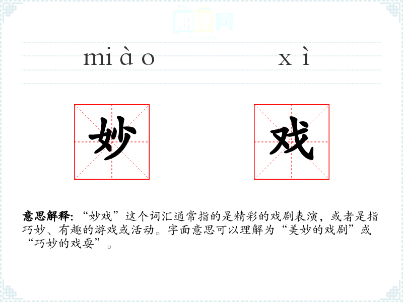 “妙戏”这个词汇通常指的是精彩的戏剧表演,或者是指巧妙、有趣的游戏或活动。字面意思可以理解为“美妙的戏剧”或“巧妙的戏耍”。