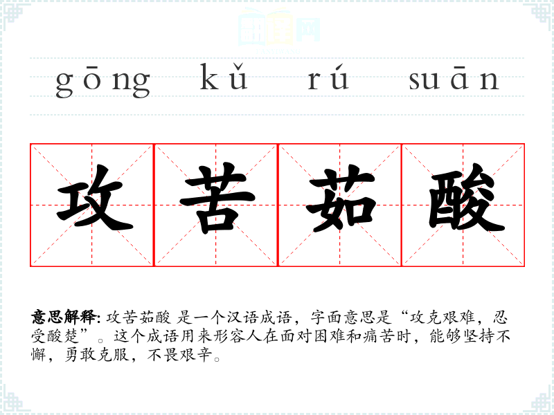 攻苦茹酸 是一个汉语成语,字面意思是“攻克艰难,忍受酸楚”。这个成语用来形容人在面对困难和痛苦时,能够坚持不懈,勇敢克服,不畏艰辛。