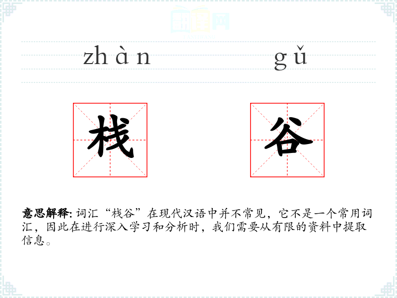 词汇“栈谷”在现代汉语中并不常见,它不是一个常用词汇,因此在进行深入学*和分析时,我们需要从有限的资料中提取信息。
