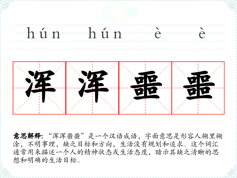 “浑浑噩噩”是一个汉语成语,字面意思是形容人糊里糊涂,不明事理,缺乏目标和方向,生活没有规划和追求。这个词汇通常用来描述一个人的精神状态或生活态度,暗示其缺乏清晰的思想和明确的生活目标。