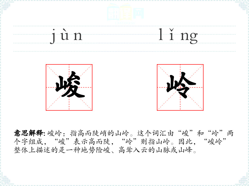 峻岭:指高而陡峭的山岭。这个词汇由“峻”和“岭”两个字组成,“峻”表示高而陡,“岭”则指山岭。因此,“峻岭”整体上描述的是一种地势险峻、高耸入云的山脉或山峰。