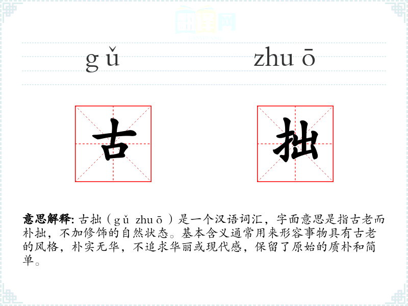 古拙(gǔ zhuō)是一个汉语词汇,字面意思是指古老而朴拙,不加修饰的自然状态。基本含义通常用来形容事物具有古老的风格,朴实无华,不追求华丽或现代感,保留了原始的质朴和简单。