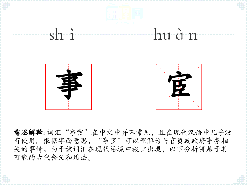 词汇“事宦”在中文中并不常见,且在现代汉语中几乎没有使用。根据字面意思,“事宦”可以理解为与官员或政府事务相关的事情。由于该词汇在现代语境中极少出现,以下分析将基于其可能的古代含义和用法。