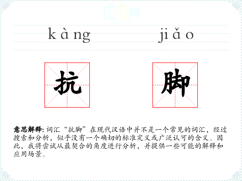 词汇“抗脚”在现代汉语中并不是一个常见的词汇,经过搜索和分析,似乎没有一个确切的标准定义或广泛认可的含义。因此,我将尝试从最契合的角度进行分析,并提供一些可能的解释和应用场景。